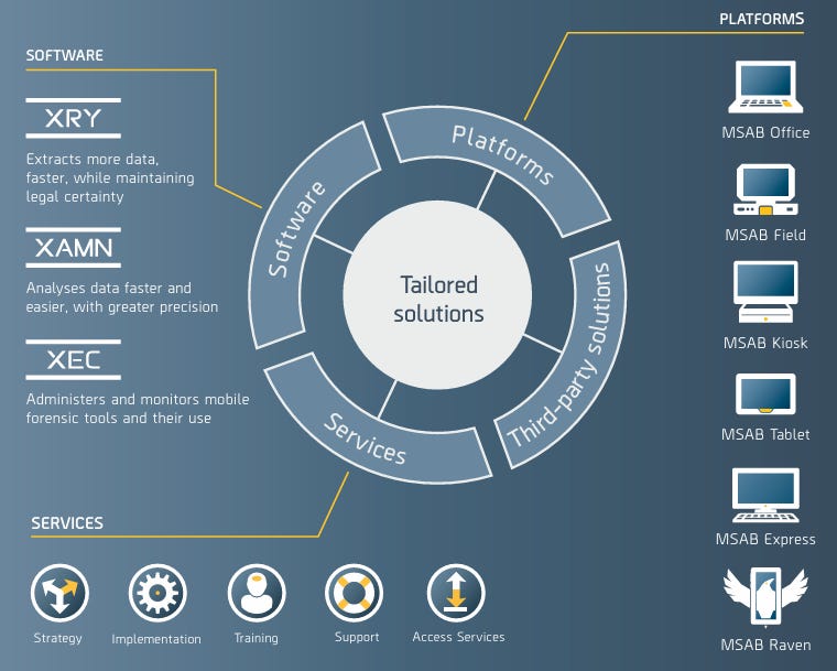 MSAB’s opportunity: Provides XRY for unlocking phones, extracting, and decoding data, and XAMN for rapid data filtering and review, including encrypted mobiles.