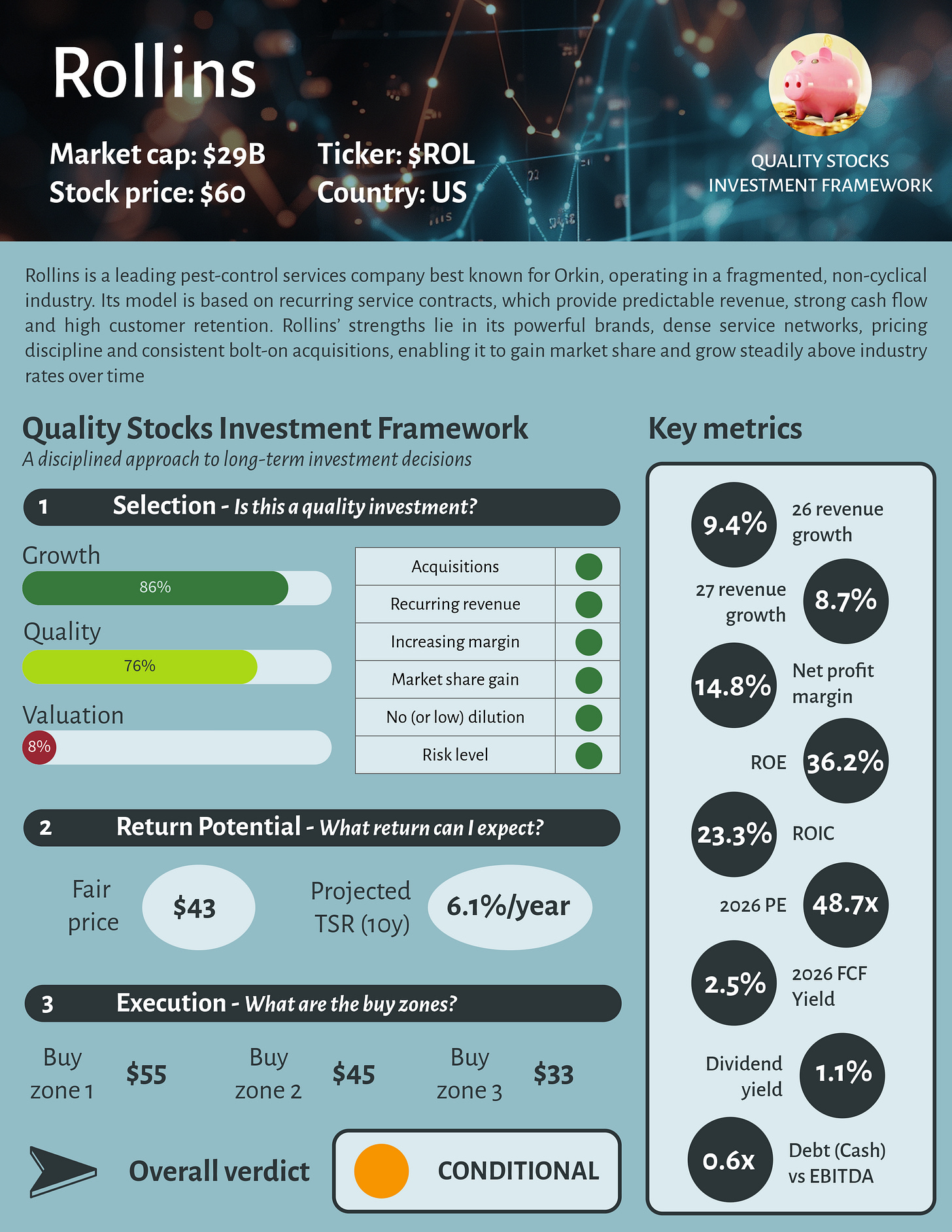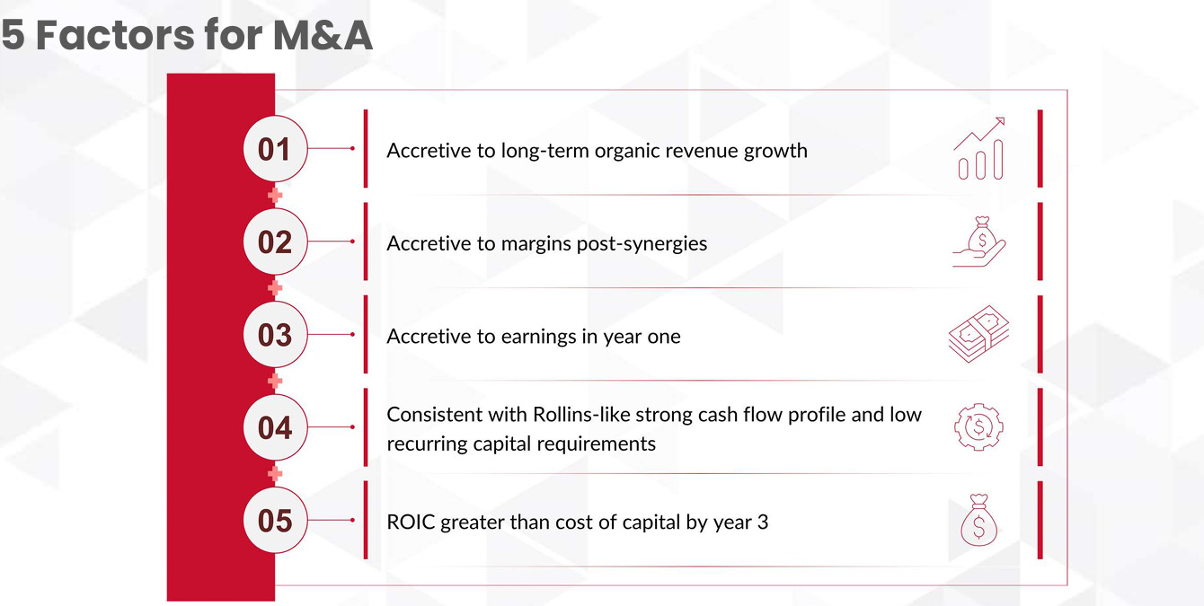 The second key driver of Rollins’ success is its disciplined and repeatable M&A strategy. Operating in a highly fragmented industry, Rollins regularly acquires small, local pest-control operators and integrates them onto its national platform, benefiting from brand strength, purchasing power and operational efficiency. These acquisitions are typically low risk, quickly accretive and reinforce local density, allowing Rollins to steadily expand its footprint, gain market share and compound growth without relying on large, transformational deals. A great element for a serial-acquirer.