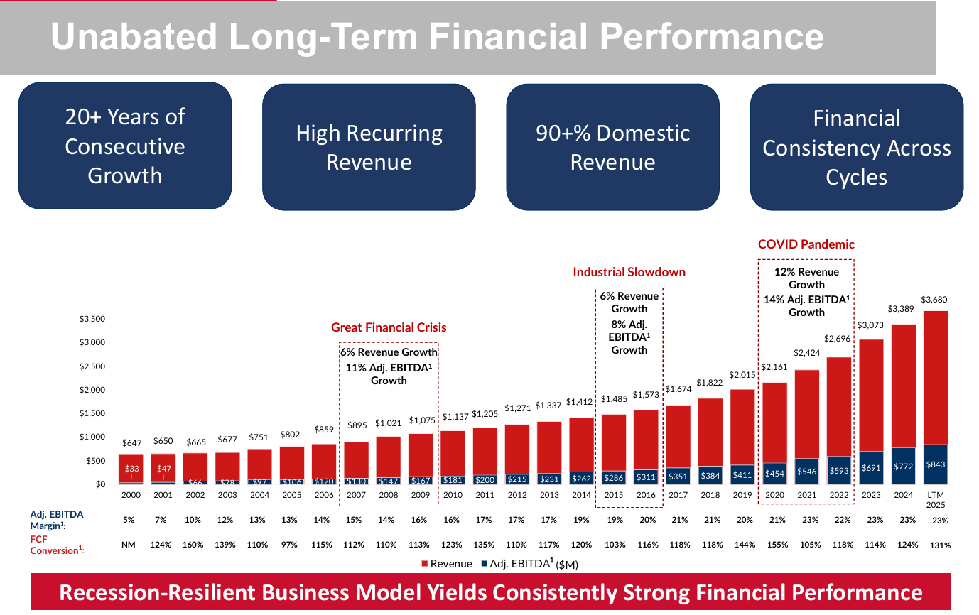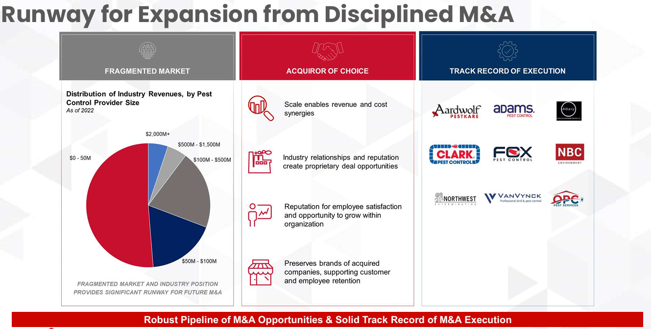Recurring revenue is a key driver of Rollins’ success because it provides predictable cash flows, high customer retention and operational efficiency. Ongoing service contracts ensure regular customer interactions, reduce churn and lower customer acquisition costs, while allowing Rollins to optimize technician routes and pricing over time. This stability enables consistent reinvestment (M&A, technology, marketing, …), reinforcing market share gains and creating a resilient growing business model largely insulated from economic cycles.