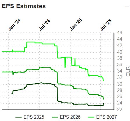 This shift is reflected in EPS estimates. Analysts have been gradually trimming their forecasts for 2026 (and even 2027) with current projections sitting about 30% below where they stood a year ago.
