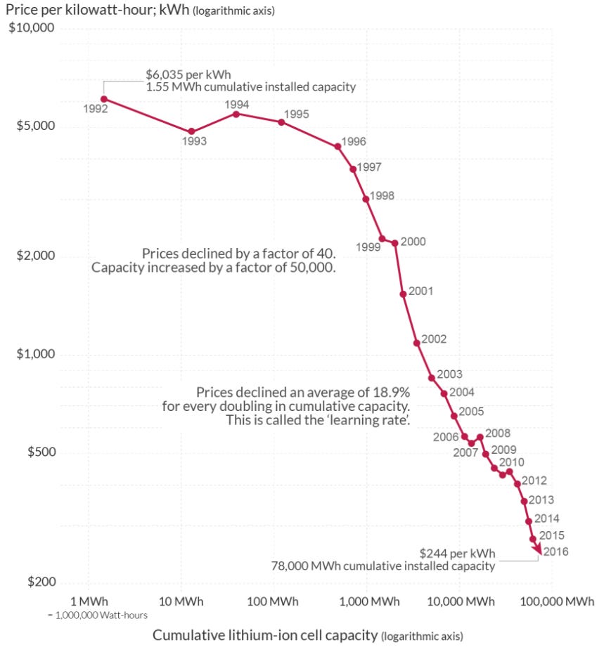 Here is an example of the price per kilowatt-hour (kWh) of lithium-ion cells, which highlights another aspect: the future pricing trends appear predictable.