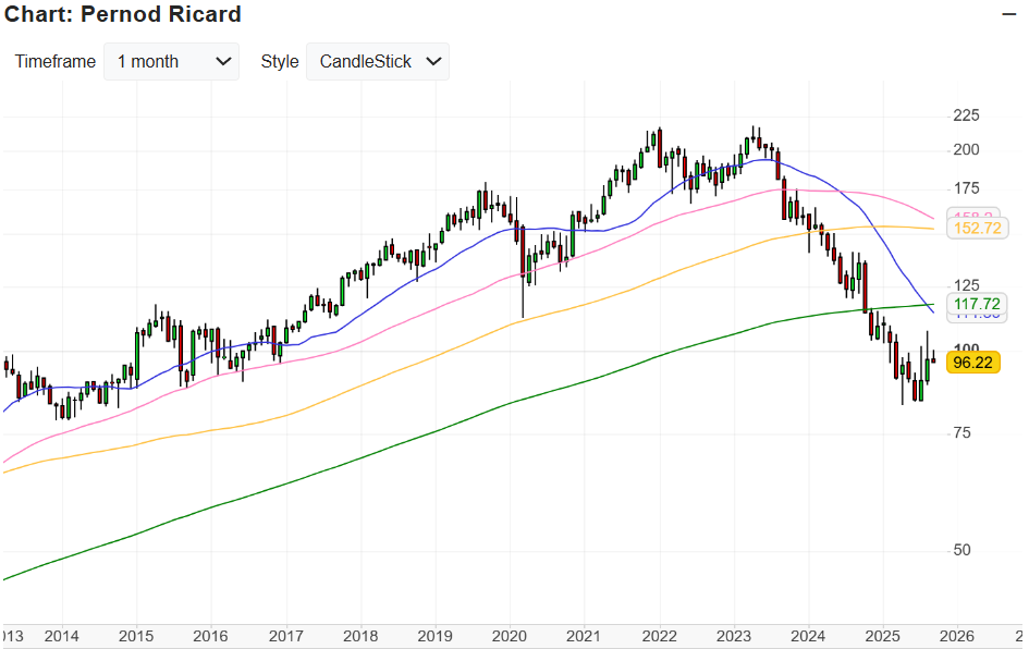 Pernod Ricard faces a similar market setup, though with key differences. The company is more diversified than Rémy Cointreau and has successfully preserved its margins, keeping its PE ratio below 15x, a much more reasonable valuation. However, it is not immune to the broader downturn. Pernod is contending with a widespread decline in global demand for alcoholic beverages (as I described in this article), which weighs on its growth outlook. Technically, the chart shows a similar setup.