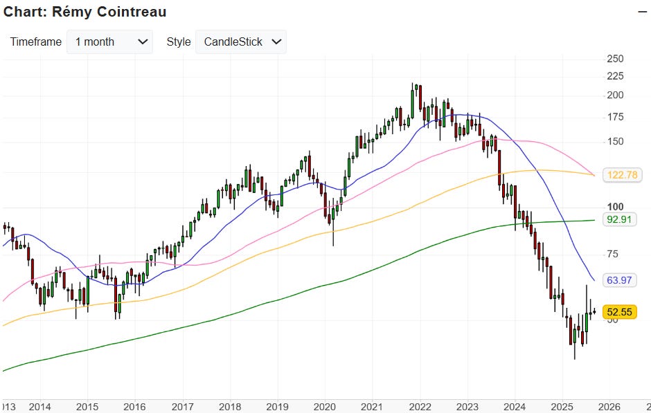 In recent years, the decline of Cognac has been nothing short of dramatic. Global demand has fallen sharply. For example, Remy Cointreau (the company most reliant on Cognac) has seen nearly 40% of its revenue vanish between 2023 and 2025, along with two-thirds of its profit margins. A true nightmare for one of the industry’s giants.